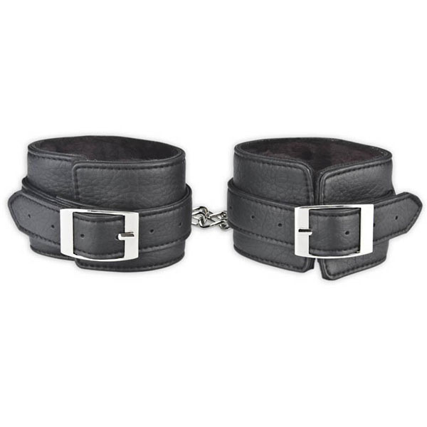 Черные фиксаторы для ног из искусственной кожи с мягким черным мехом внутри для большего комфорта при сковывании Вашего партнера. Между собой браслеты соединяются металлической цепью с крупными звеньями, застегиваются на замок с ключами (есть в комплекте). One size.