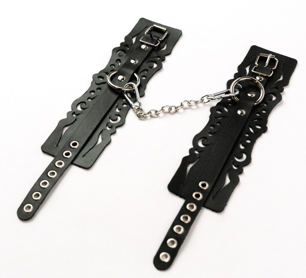 Кожаные узорчатые оковы имеют регулируемые ремешки. Оковы снабжены металлическими кольцами и сцепкой.