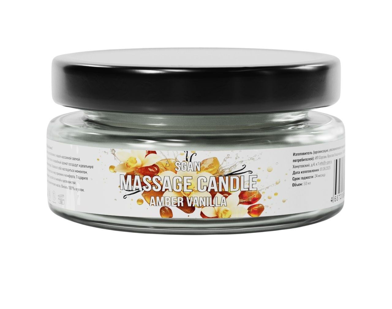Массажная свеча с ароматом амбры и ванили SGAN в стеклянной банке — это натуральное средство для расслабления, ухода за кожей и создания романтической атмосферы. Свеча изготовлена из 100% кокосового воска с добавлением ароматического масла амбры ваниль и хлопкового фитиля, что обеспечивает безопасное и чистое горение. При нагревании свеча превращается в тёплое массажное масло, которое глубоко увлажняет, питает и смягчает кожу, делая её шелковистой и ухоженной. Приятный аромат амбры и ванили наполняет комнату уютом и гармонией.