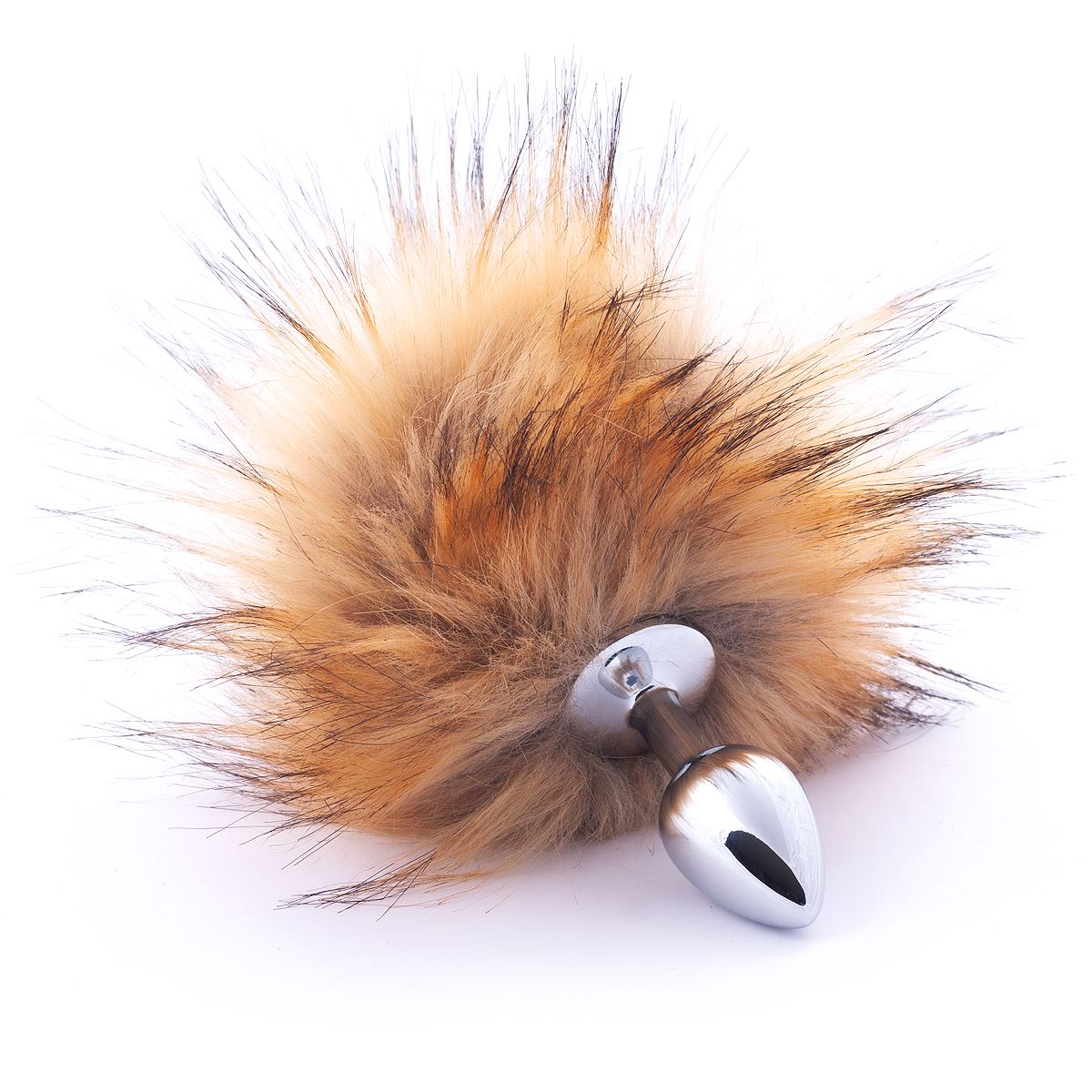 Серебристая анальная пробка с коричневым хвостиком. Искусственный эко-мех. Диаметр хвоста — 15 см.